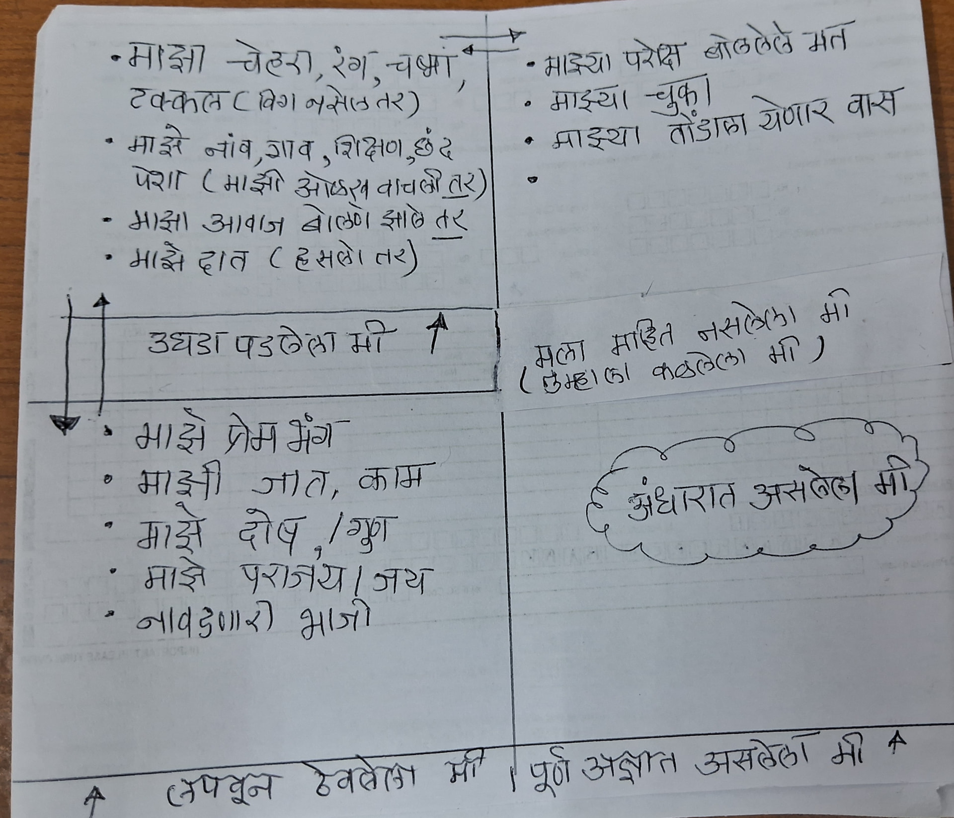चौथे दालन म्हणजे अंधार कोठडी ! तिथे माझ्या बद्दल काय दडले आहे हे मलाही ठाऊक नाही, दुसऱ्यांना देखील ठाऊक नाही. कधी तरी, एखाद्या अतिशय कठीण प्रसंगी, माझ्याही नकळत, एखादी अज्ञात क्षमता काळोख्या रात्री वीज चमकावी तशी चमकू शकते.